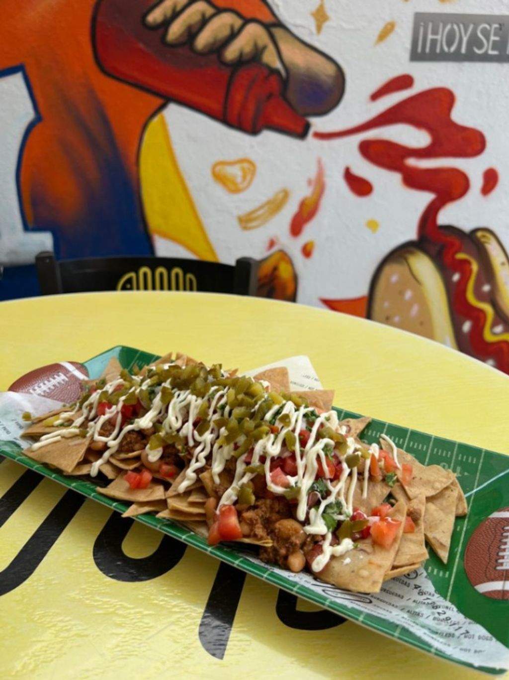 Crujientes tortillas de maíz, fritas al instante, chili artesanal con receta secreta de la casa, coronados con aderezo de mayonesa, jitomate fresco, cebolla morada, cilantro y jalapeño.