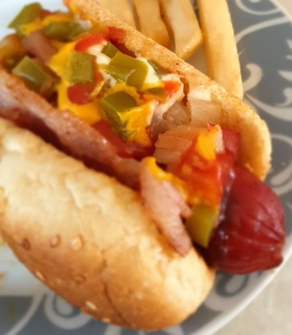 125 grs de salchicha de res tamaño jumbo asada al carbón y tocino ahumado. Coronado con jitomate fresco, cebolla, cilantro y jalapeño.