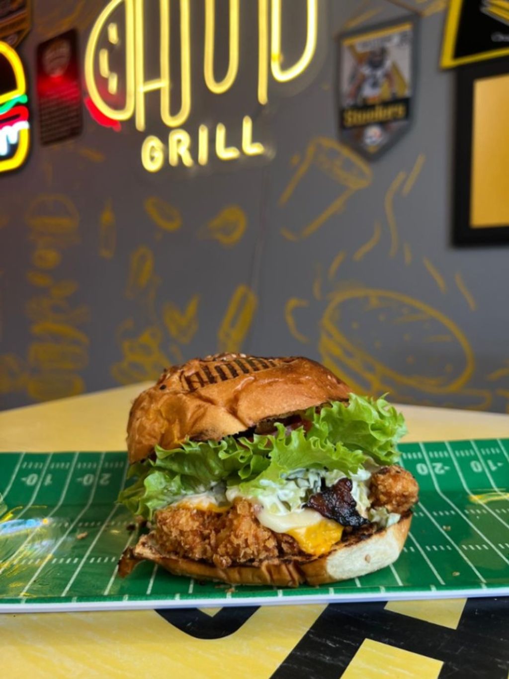 180 grs de pechuga de pollo crocante al panko para lograr textura extra crujiente y dorada. Servida en pan brioche artesanal con fusión de quesos, piña caramelizada, tocino ahumado y aderezo tártara.