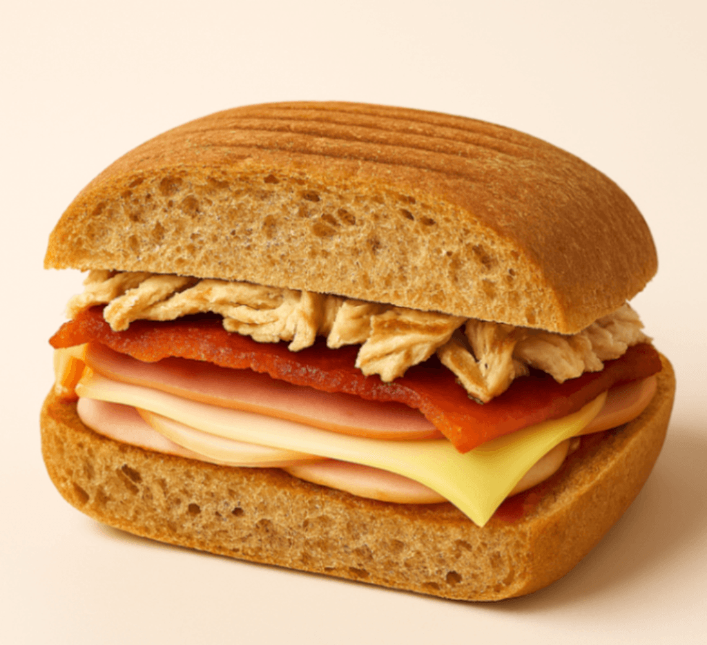 1/2 Chapata integral, pollo, jamón de pavo, queso, tocino y aderezo jalapeño.