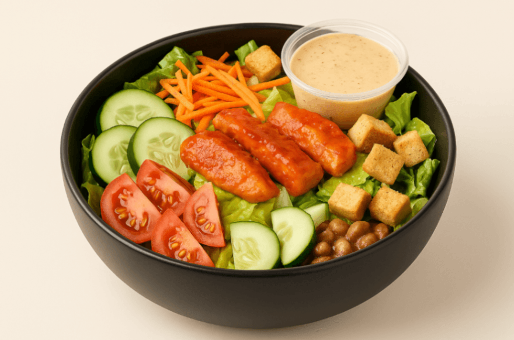 Lechuga romana, pollo buffalo, tomate, zanahoria, pepino y crutones con aderezo césar southwest.