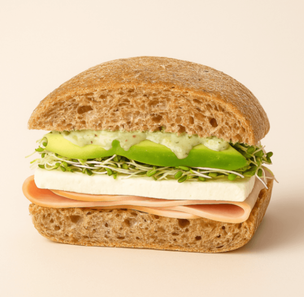 1/2 Chapata centeno, jamón de pavo, queso fresco, alfalfa, aguacate y aderezo cilantro-jalapeño.