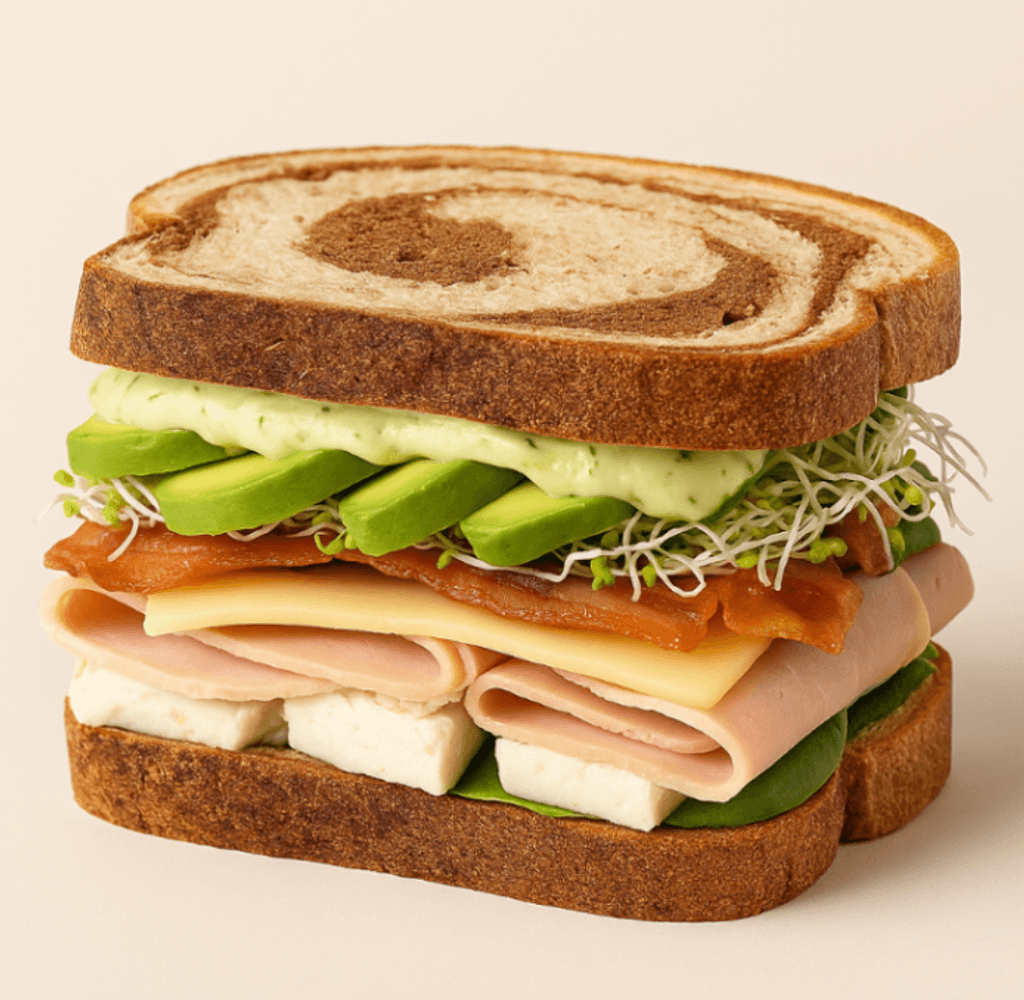 Jamón de pavo, queso menonita, tocino, aguacate, alfalfa y aderezo cilantro-jalapeño de la casa.