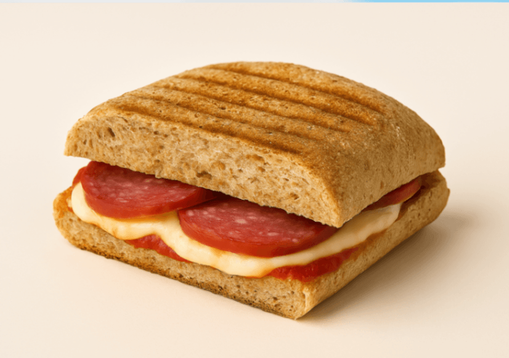 1/2 Chapata integral con salsa de tomate, queso menonita y salami.