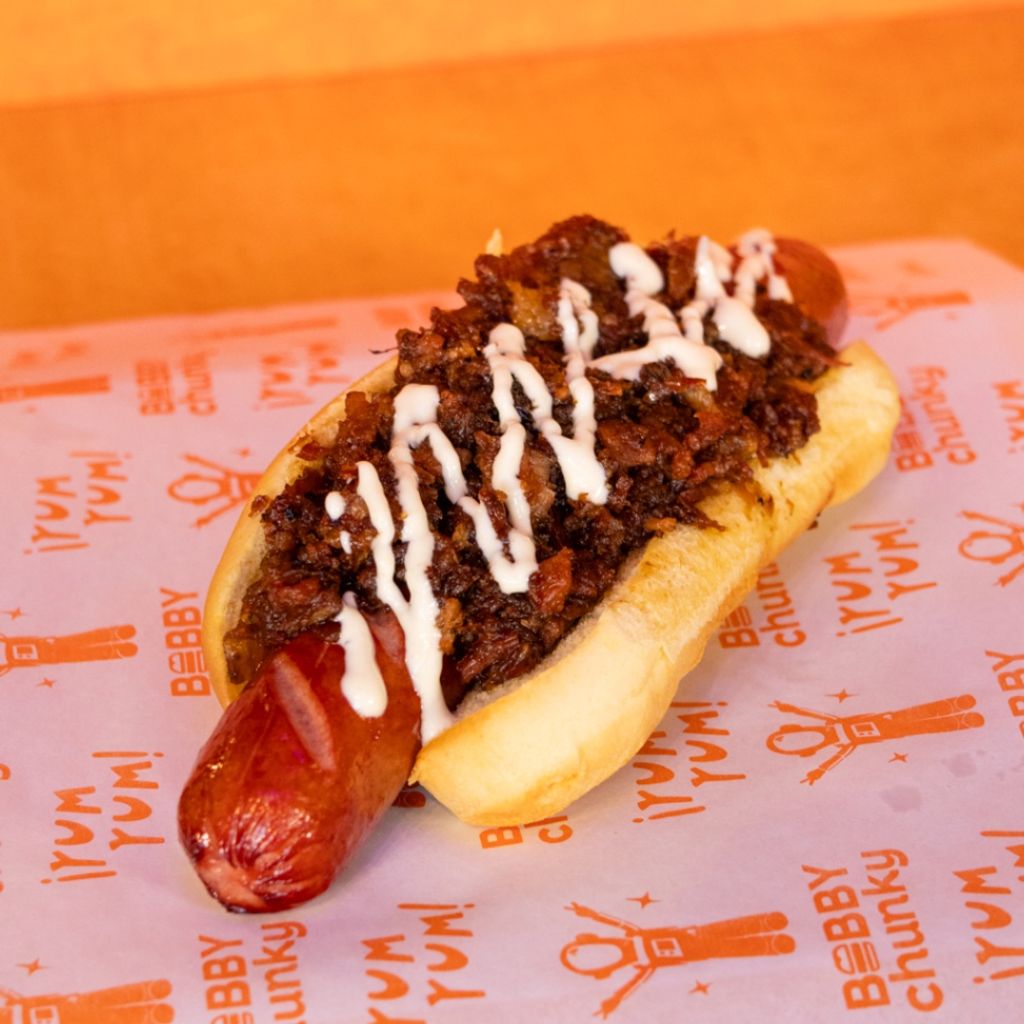 Salchicha de res premium, mermelada de tocino de la casa y aderezo de ajo