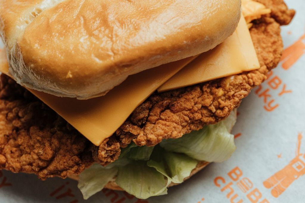 pan artesanal, aderezo a elegir, lechuga, pechuga de pollo empanizada y queso americano.