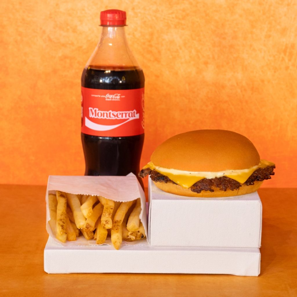 Pan de papa, Cheese Burger con 150grs de carne angus, papas a la francesa 100gr y refresco a elegir