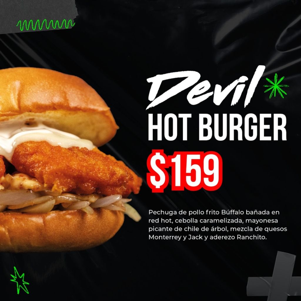 pechuga de pollo frito buffalo bañada en red hot, cebolla caramelizada, mayonesa picante de chile de árbol, mezcla de quesos monterrey y Jack y aderezo ranchito