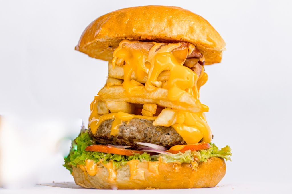 250 gramos de carne de la casa, Base de vegetales, Papas a la francesa, mezcla de queso Mozarella y Cheddar y Tocino.