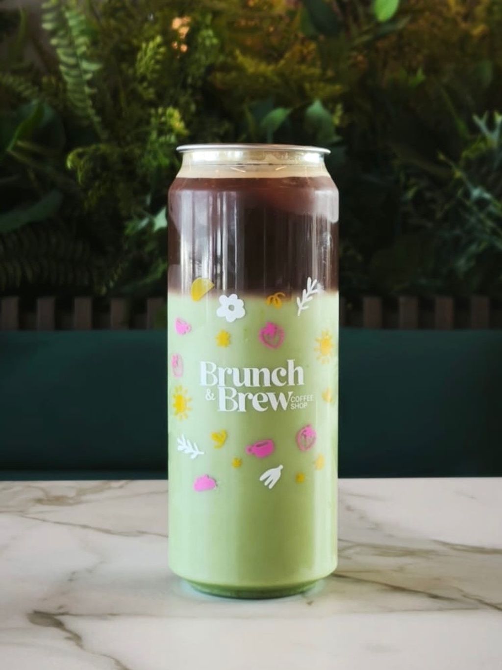 Hojas finamente molidas de té verde, mezclado con agua y leche Mas un espresso
