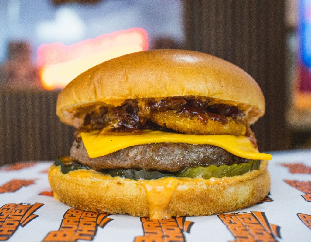 Pan Brioche, carne de res con queso americano, dos aros de cebolla, mermelada de tocino y un toque de salsa ahumada, aderezo de la casa y