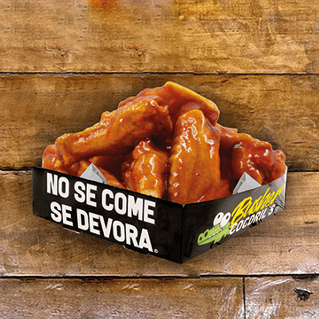 Alitas de pollo sazonadas y freídas, bañadas en la salsa de tu preferencia.