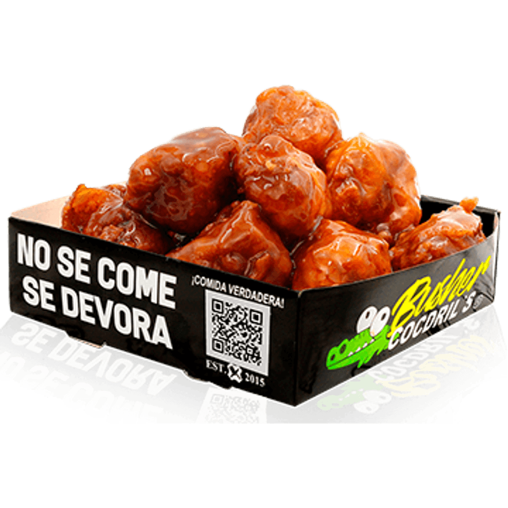 Pollo empanizado, sazonado y freído, bañado en la salsa de tu preferencia.