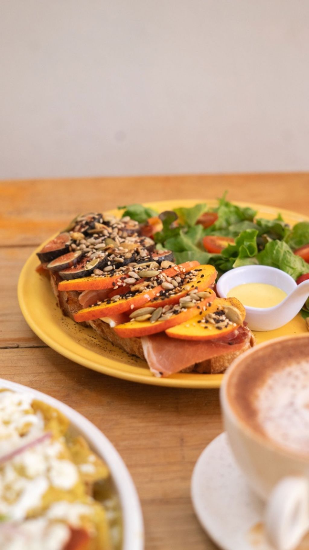 Pan campesino blanco, queso crema, germen de alfalfa, láminas de salmón ahumado, aguacate, granos tostados, miel y salsa de chiles.