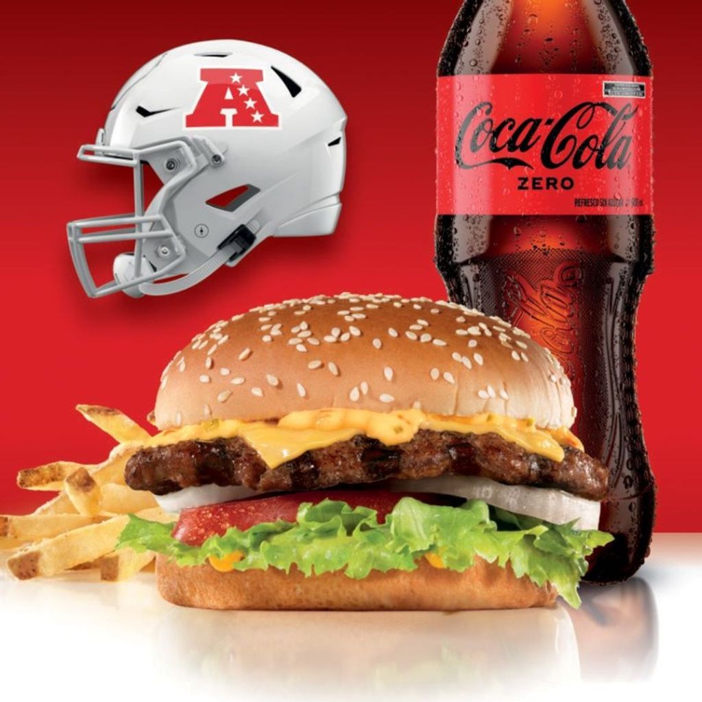 Se prepara con una carne de res a la parrilla, Salsa ALL IN ONE, Queso Americano, Cebolla, Tomate, y Lechuga en un Bollo con ajonjolí. Incluye papas a la francesa chicas (105 gr) y refresco pet 600 ml