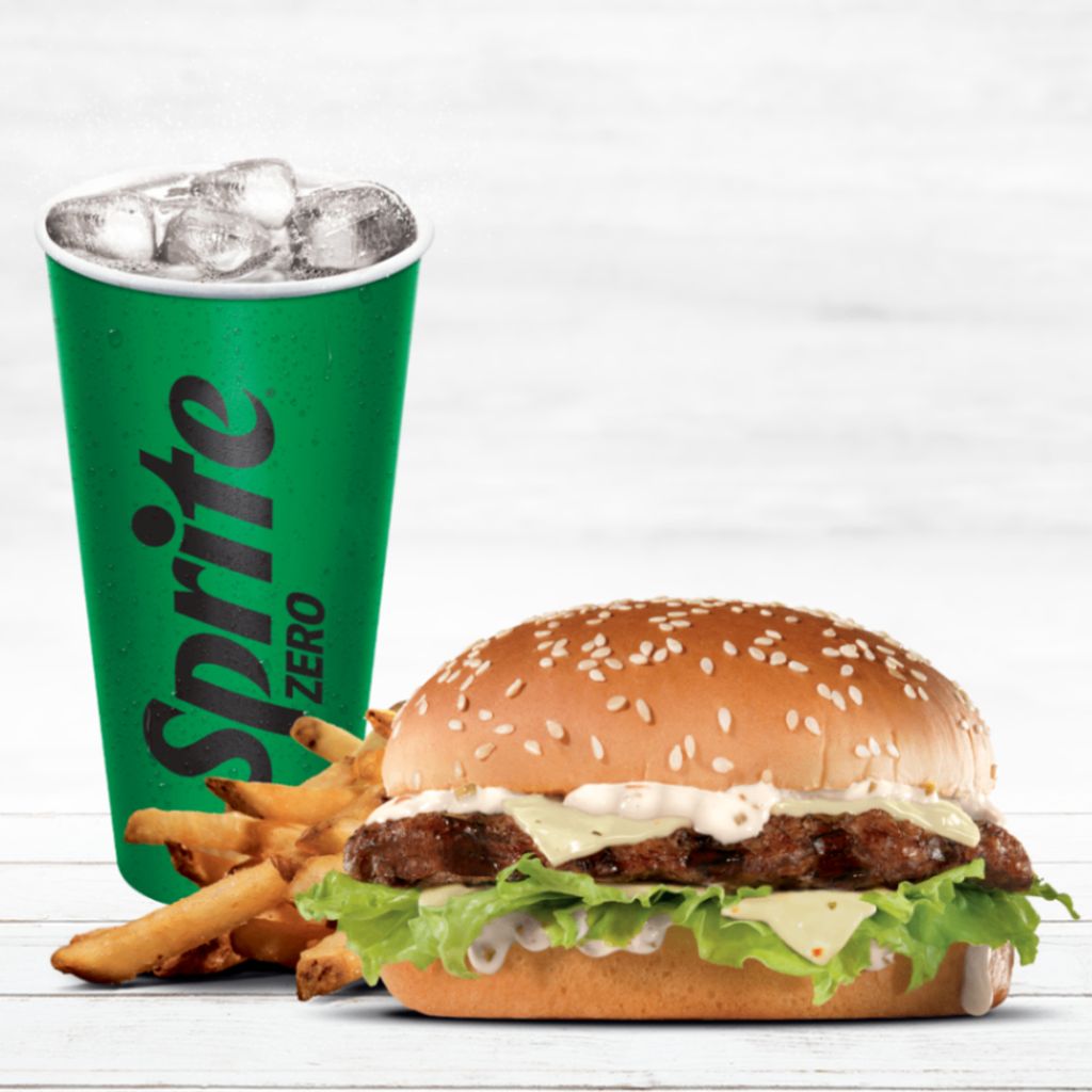 Se prepara con una carne de res a la parrilla, Aderezo Spicy, 2 rebanadas de Queso Pepperjack, Lechuga en un Bollo con ajonjolí. Incluye papas a la francesa chicas (105 gr) y refresco pet 600 ml