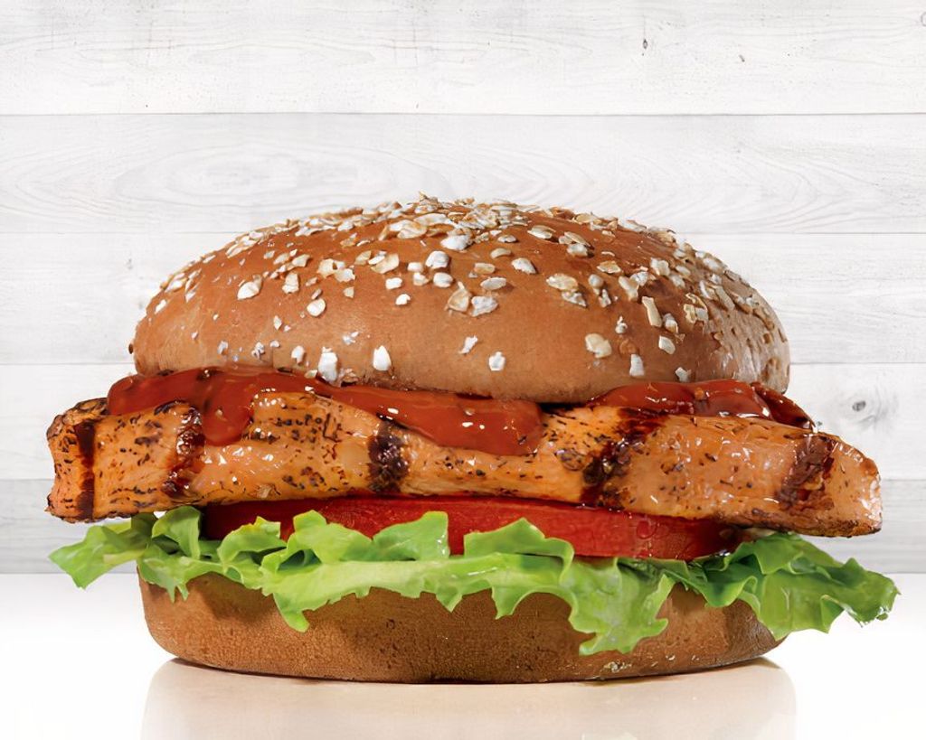 Sándwich con pechuga de pollo a la parrilla, lechuga, tomate y salsa BBQ, en pan integral.