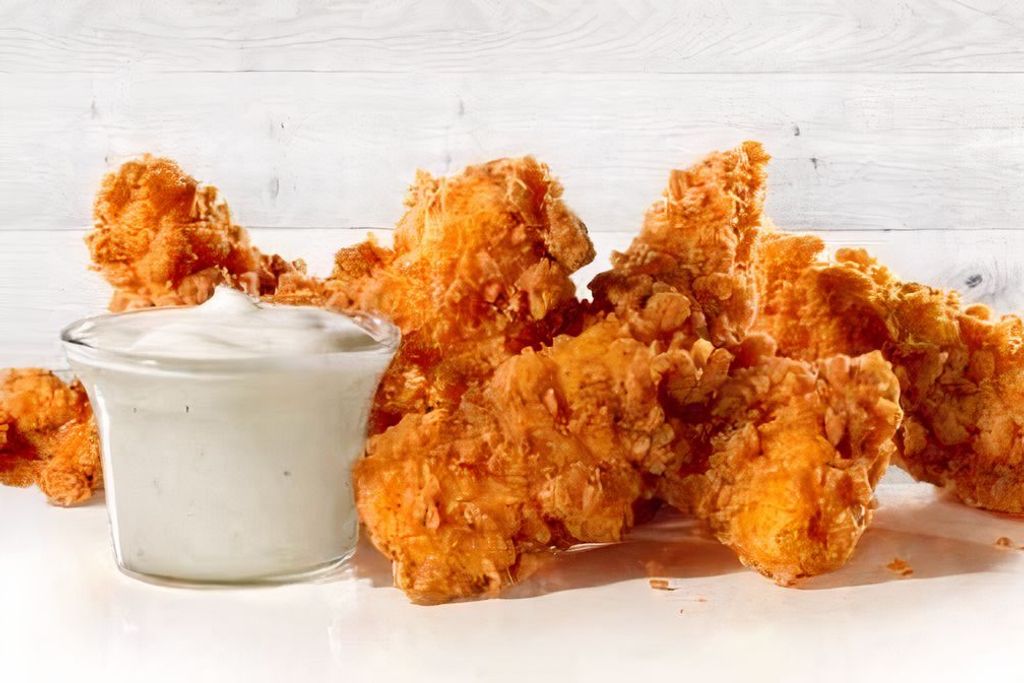 Pollo en tiras empanizadas preparadas al momento de ordenar.