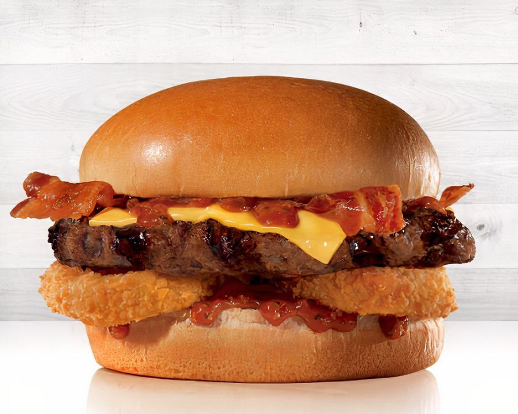Hamburguesa con carne 100% black angus asada a la parrilla, tres tiras de tocino, dos rebanadas de queso americano, aros de cebolla empanizados y salsa bbq.