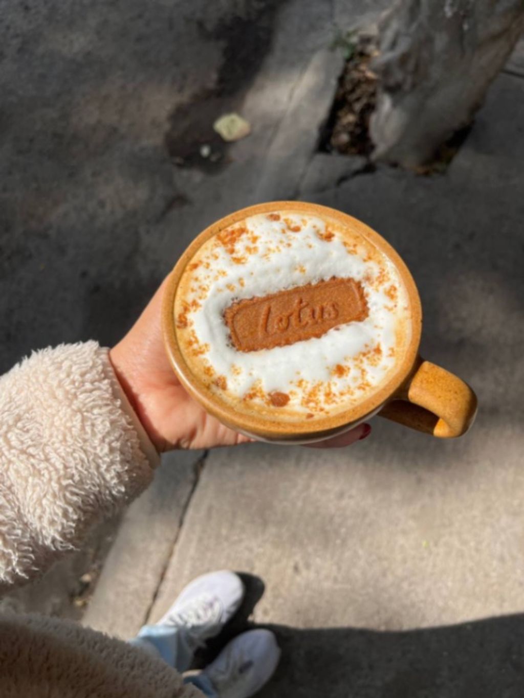 Capuccino caliente mezclado con crema de Lotus, delicioso, decorado con una galleta Lotus