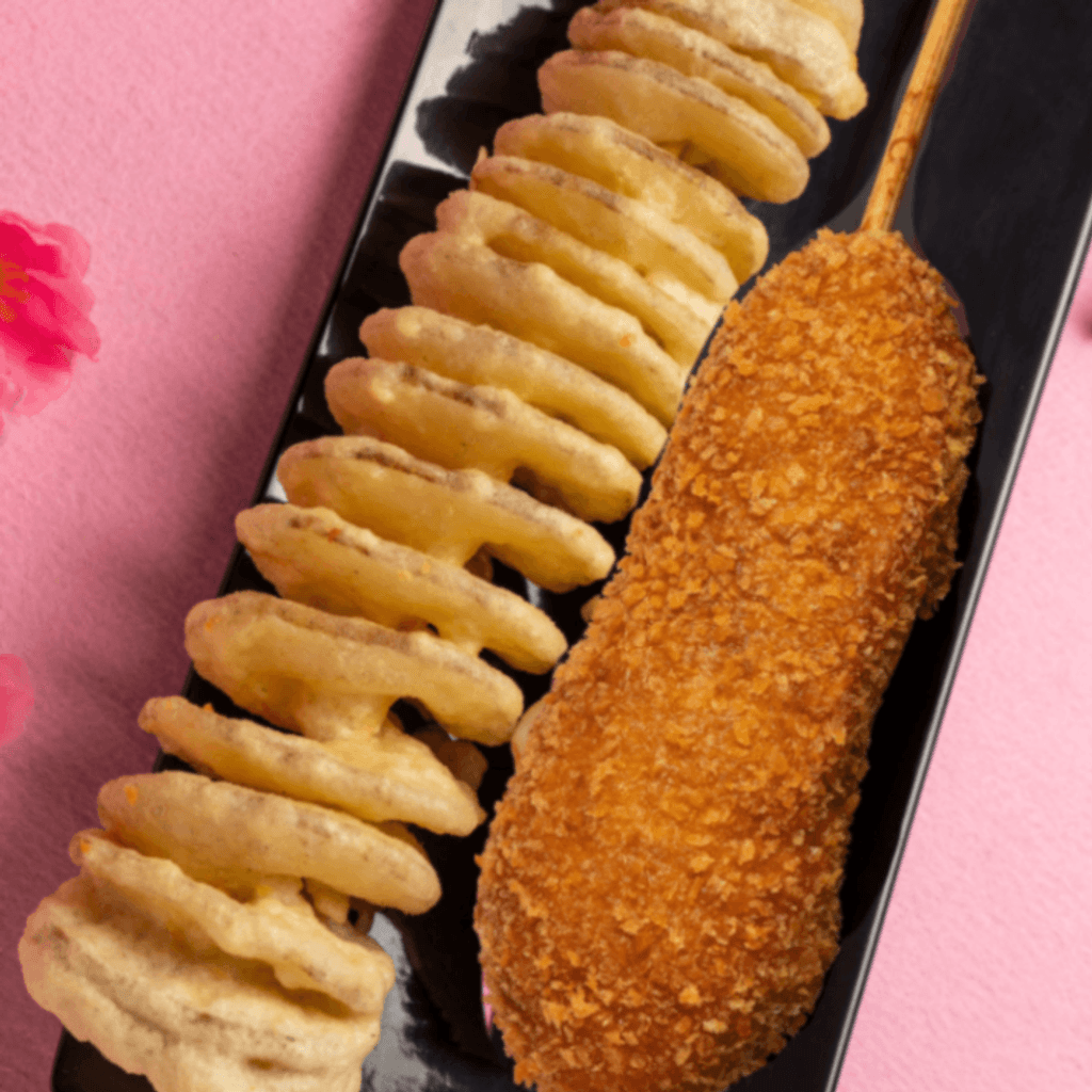 Deliciosa banderilla con cubierta de pan molido japones, relleno de salchicha de res, acompañado de una papa tornado clásica y un té de la casa.
