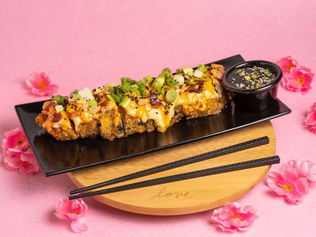 Rollo empanizado, relleno de pollo frito, carne de res en salsa bulgogi, tocino, espinaca, zanahoria, pepino y queso crema envueltos en alga. Gratinado con queso monterrey y topping de tocino, adornado con cebollín. Incluye un té de la casa o una limonada rosa de cortesía. Todo cambio tiene costo adicional.