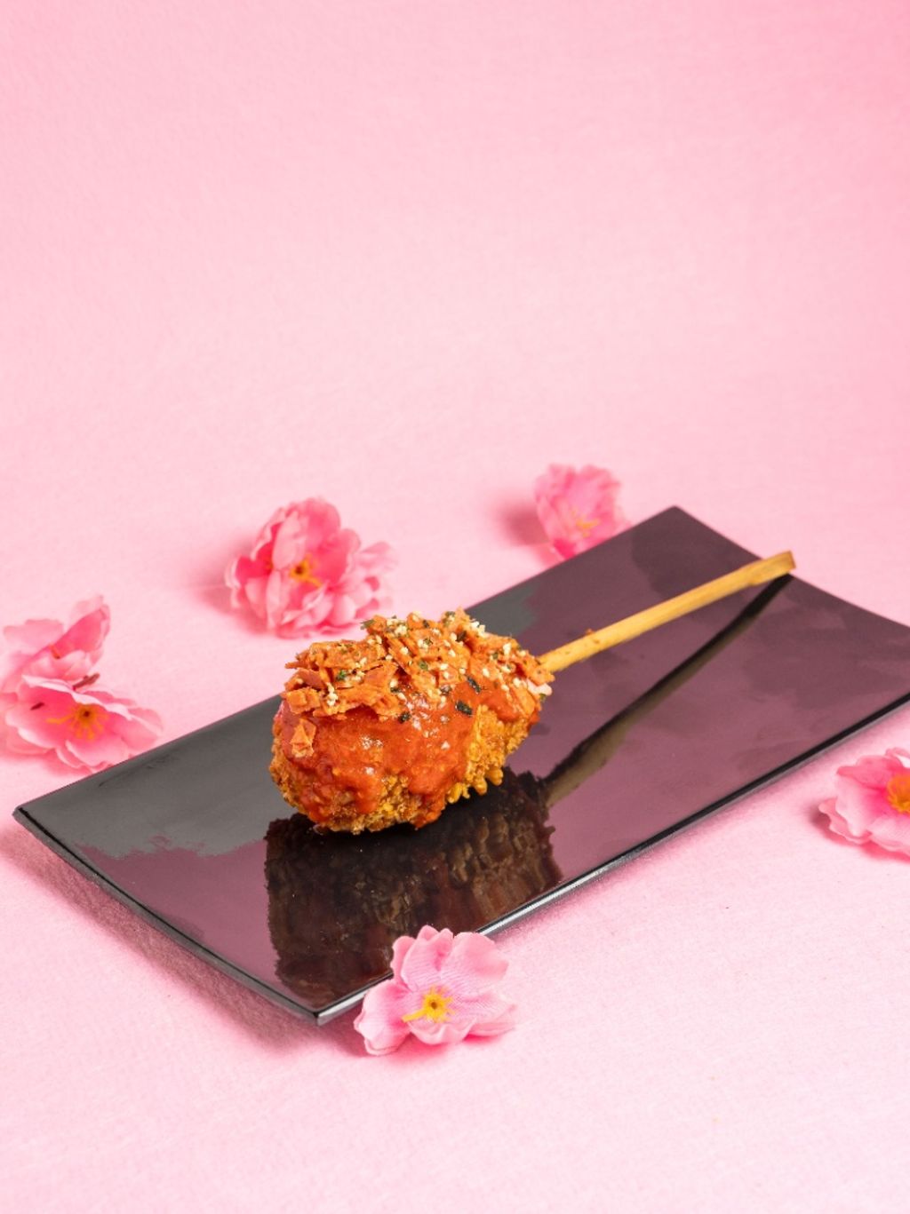Banderilla coreana con relleno de queso mozzarella y cubierta de pan molido japones, bañada en salsa de pizza con topping de pepperoni.