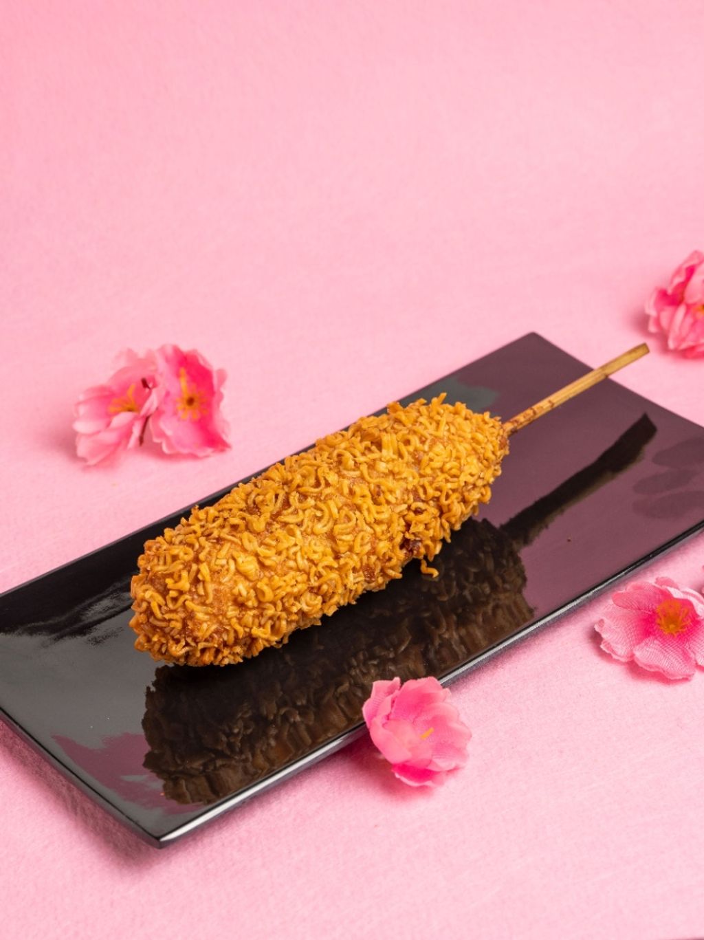Banderilla cubierta de ramen frito y pan molido japones con relleno de salchicha de res.