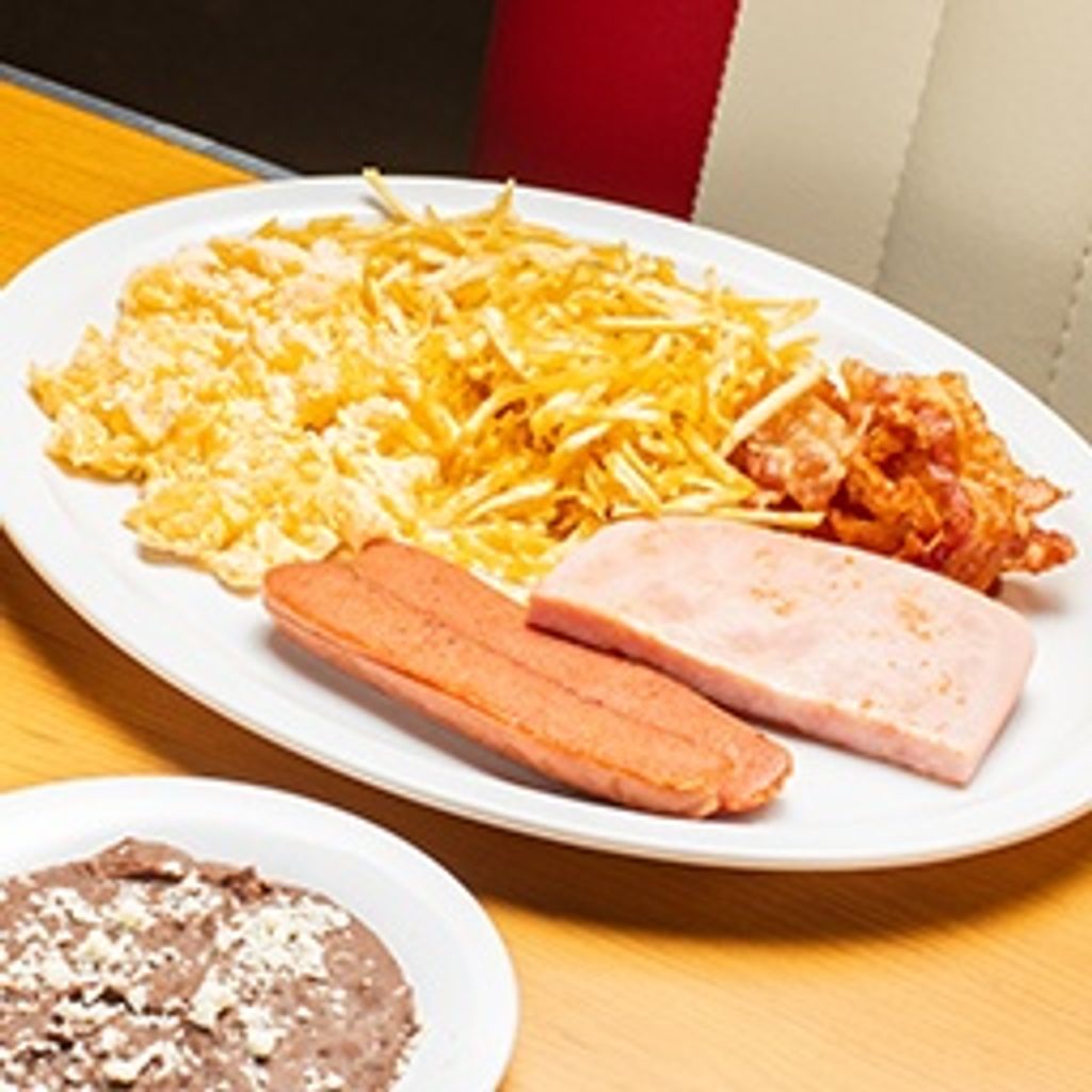 Huevo revuelto (2pzs), jamón, tocino, salchicha, papas hash brown y frijoles