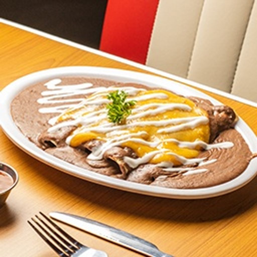 (4 pzs) rellenas de pollo bañadas en crema de frijol negro y queso fundido