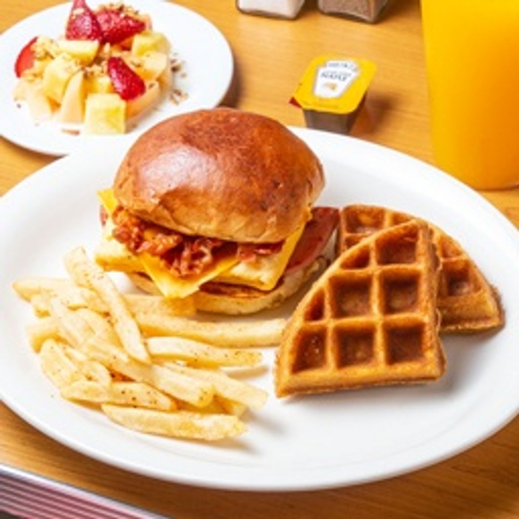 Sandwich de pan brioche con queso, huevo, jamón, tocino, acompañado de (2 pzs) de waffle y papas fritas