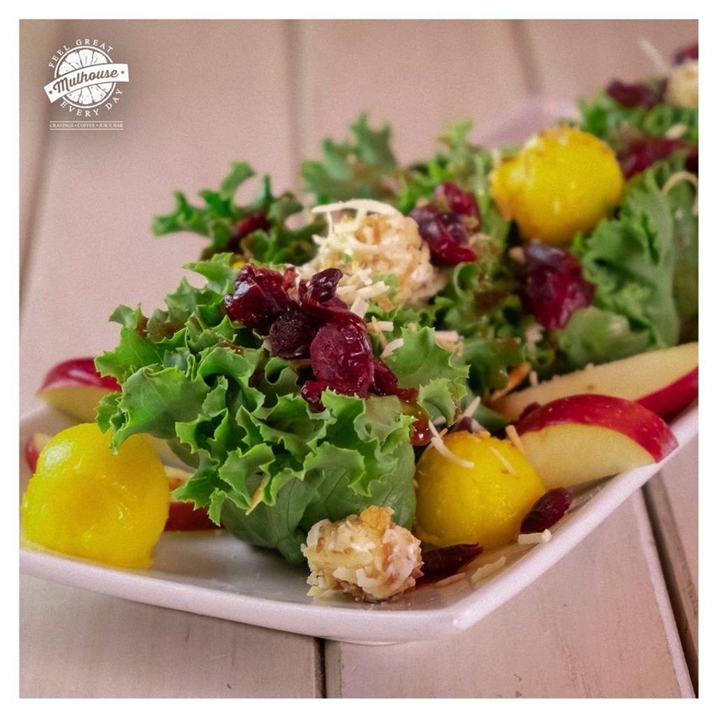 Lechuga italiana, durazno, manzana, bolitas de queso crema con coco tostado y arándanos con aderezo honey mustard