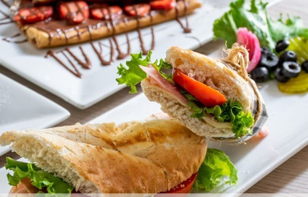 Pan baguette artesanal con jamón de pavo. Todos nuestros baguettes incluyen queso mozzarella, lechuga, jitomate, pepinillo, aceitunas negras y cebolla encurtida.