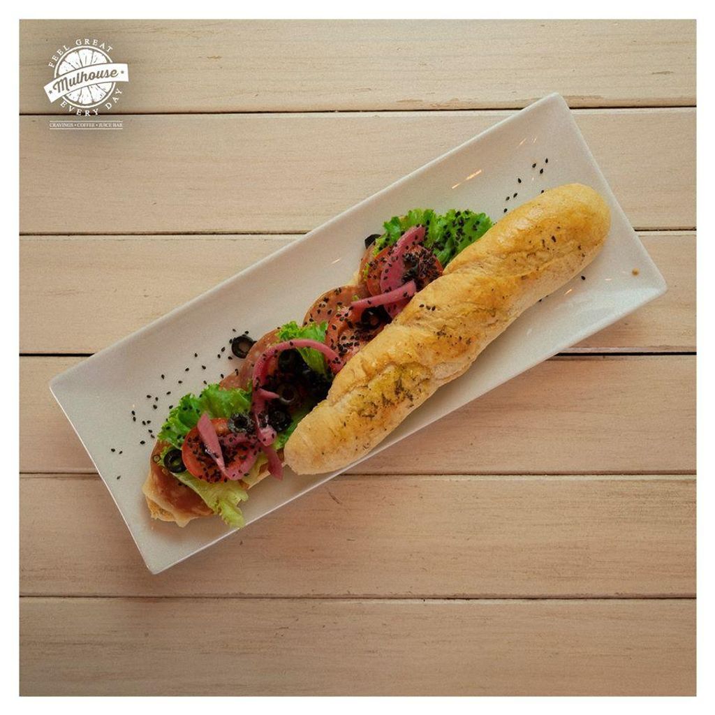 Pan baguette artesanal con salami. Todos nuestros baguettes incluyen queso mozzarella, lechuga, jitomate, aceitunas negras y cebolla encurtida.