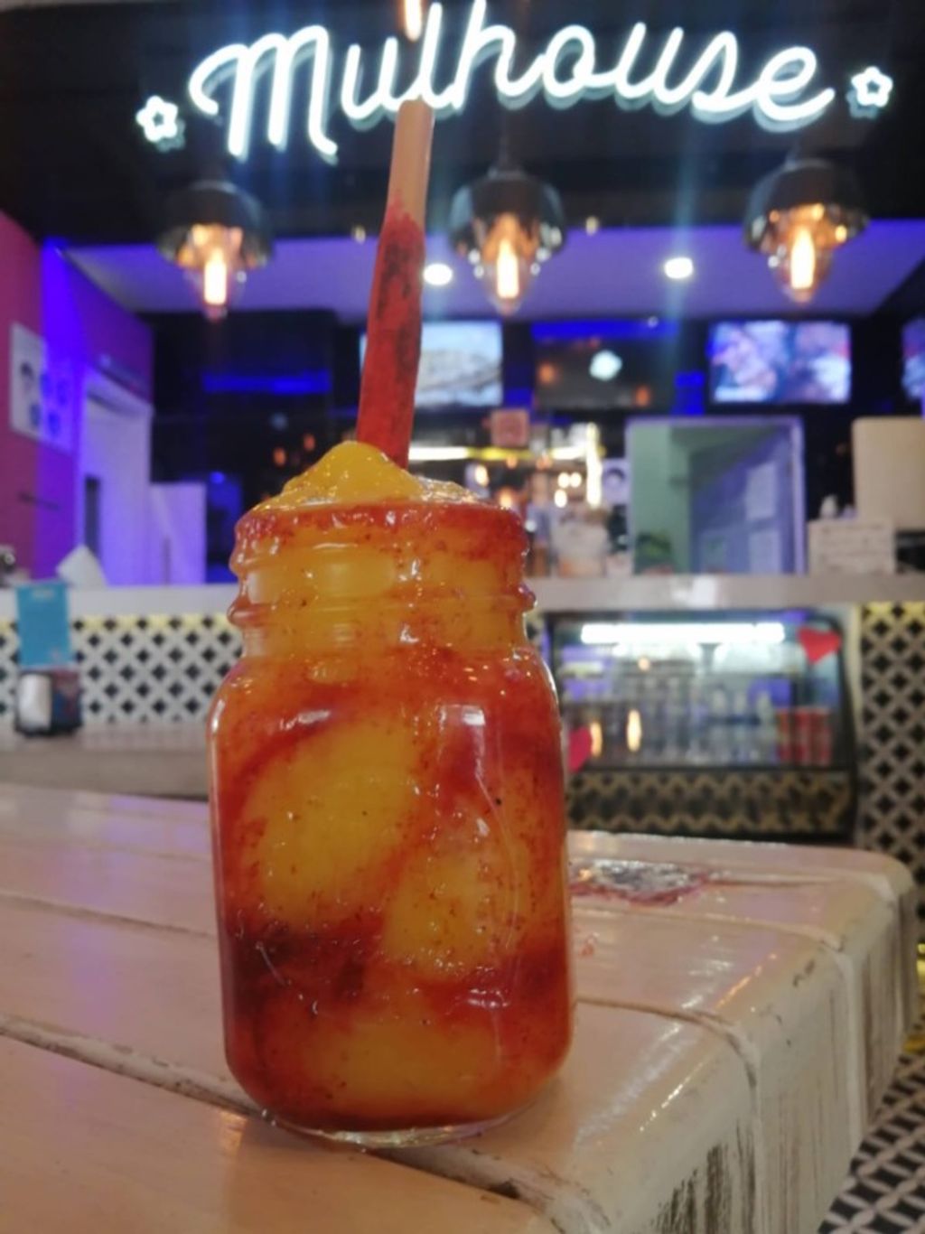 Bebida frapeada base agua hecha de fruta natural con chamoy líquido y en polvo.