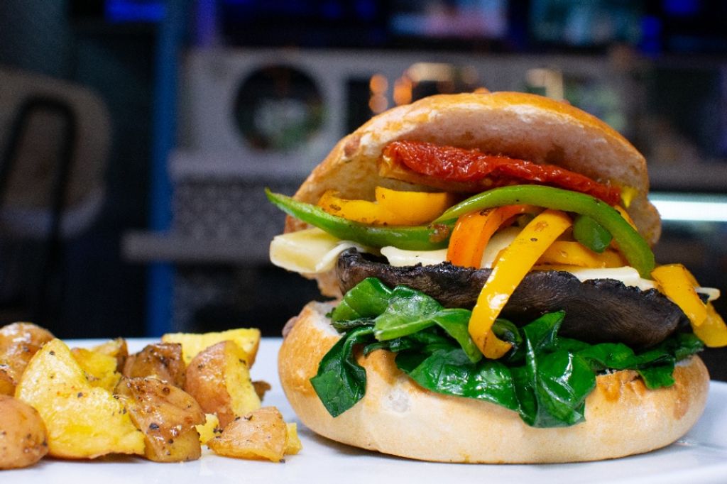 Portobello a l a plancha, queso manchego, e s p i n a c a s , pimiento morrón salteados, tomate deshidratado y aderezo blue chesse.