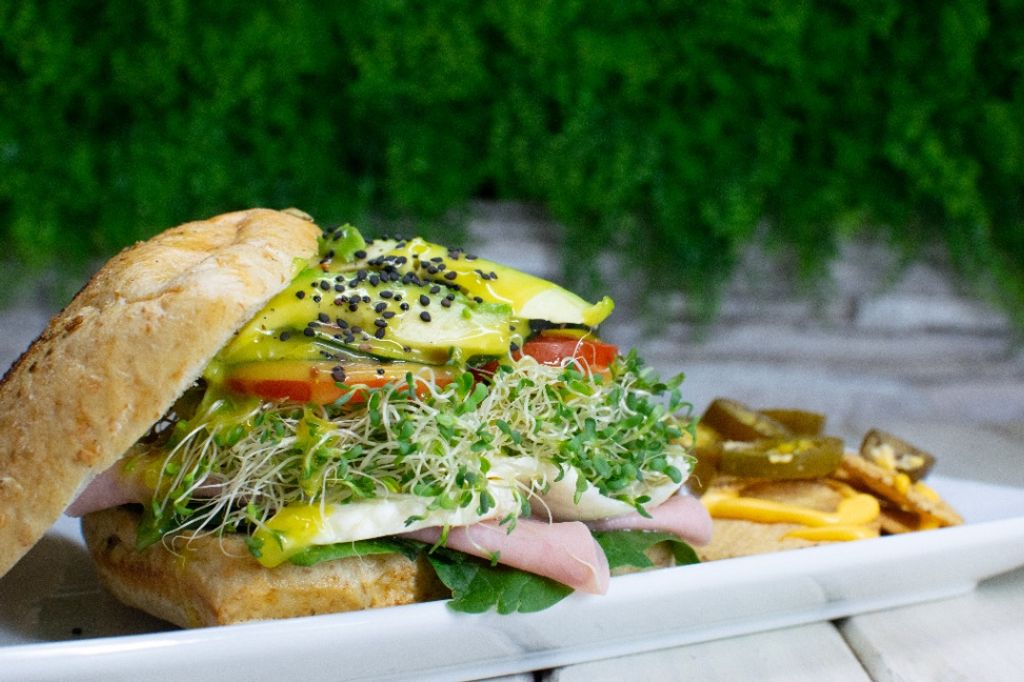 Jamón de pavo, aguacate, jitomate, queso panela, germinado de alfalfa, pepino, espinaca fresca y aderezo de miel y mostaza