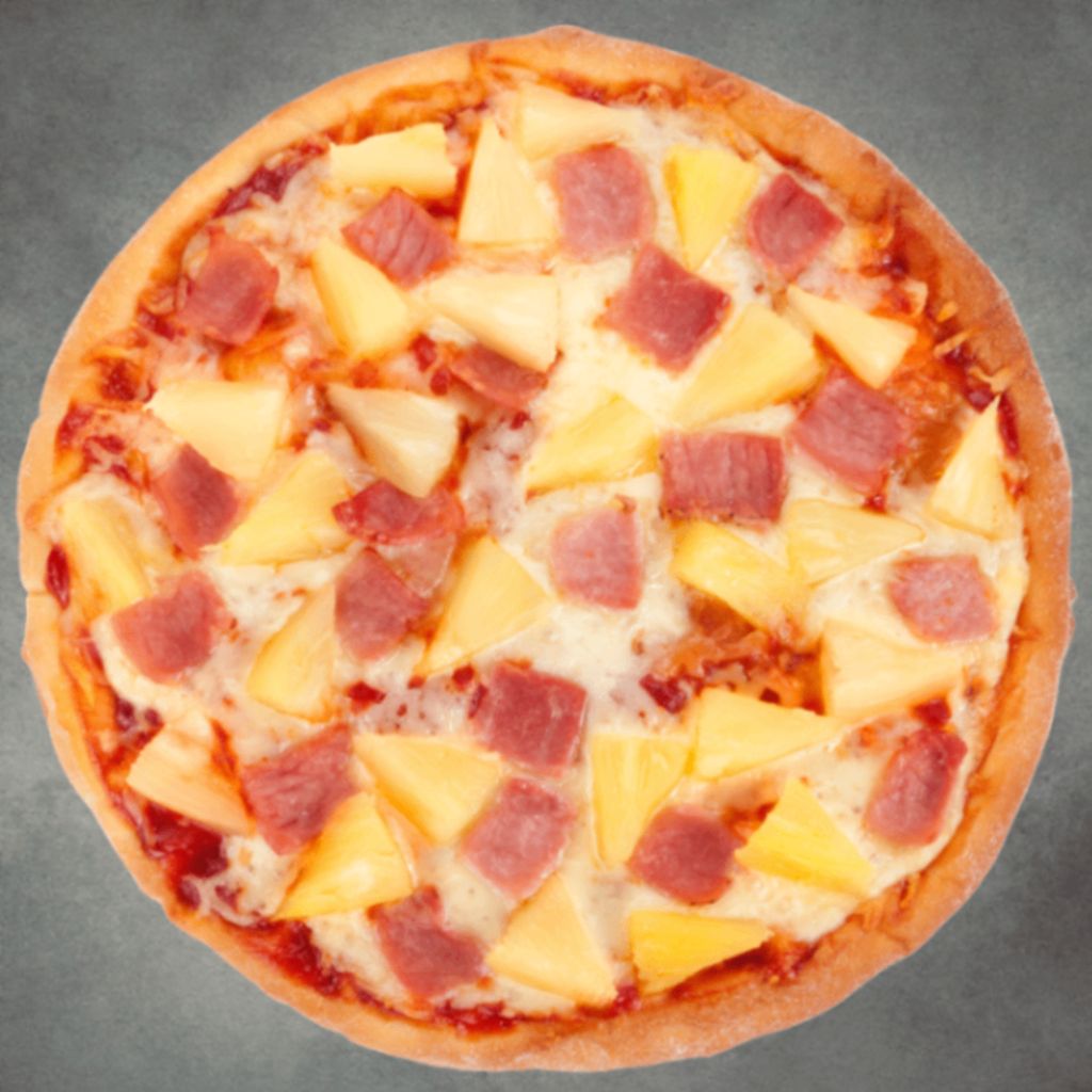 Salsa pomodoro, queso mozzarella, jamón, piña.