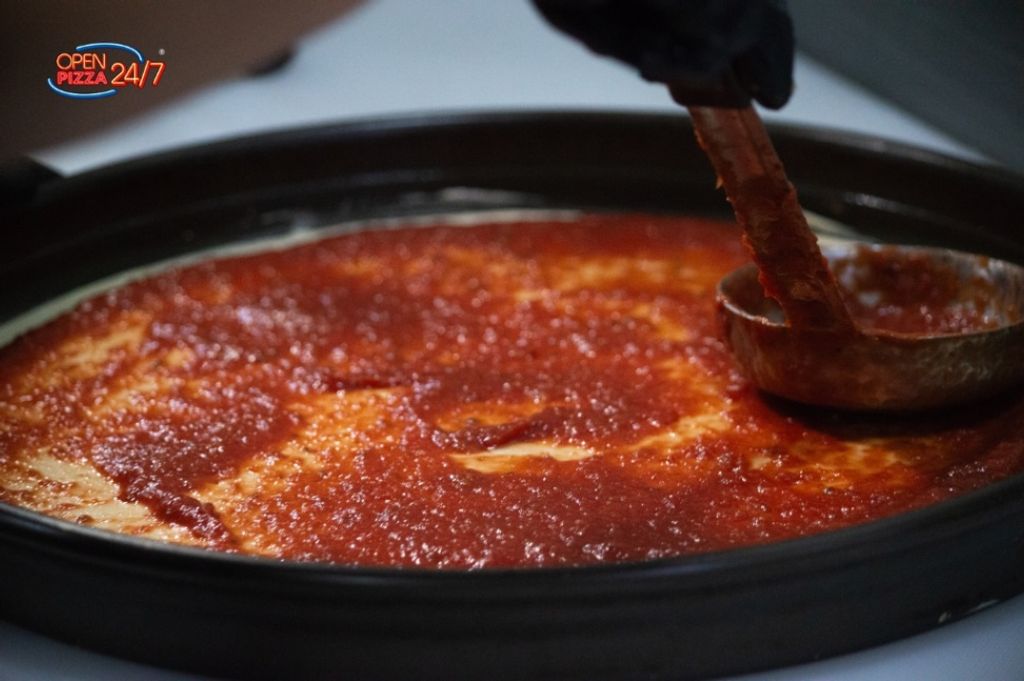 Pizza con Mezcla de 3 Quesos, Pepperoni, Salchicha Italiana, Pimiento Verde, Cebolla, Aceituna y Parmesano Fresco.