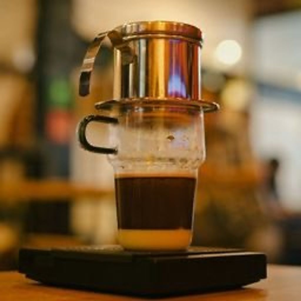 Café preparado en un filtro metálico que gotea lentamente sobre la taza, dando como resultado una bebida intensa y de cuerpo pleno. Lo acompañamos con nuestra receta especial de leche dulce.