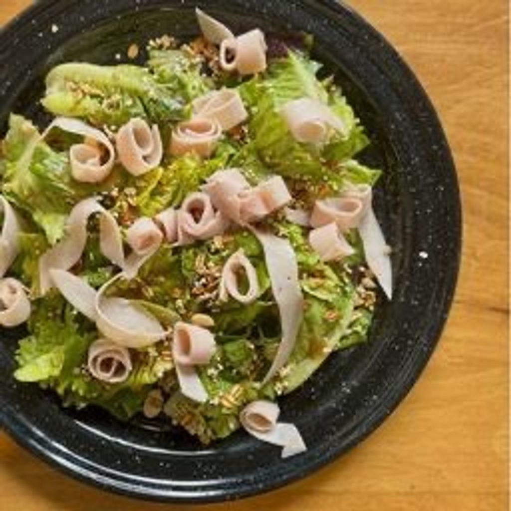 Mix de lechugas con jamón de pavo. Cambia por jamón serrano o salame +$20.00.