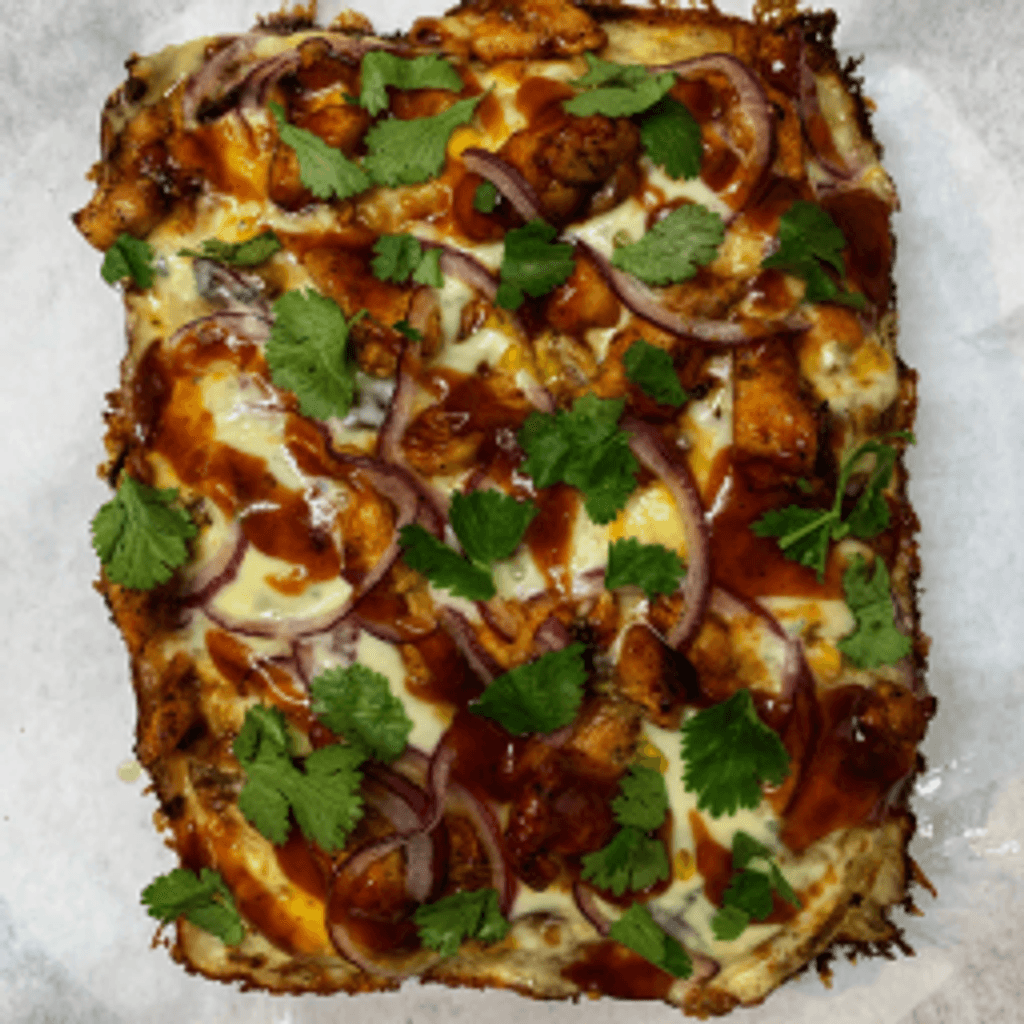 Pollo asado en BBQ, cebolla morada, cilantro, queso mozzarella, queso gouda y aderezo de blue cheese.