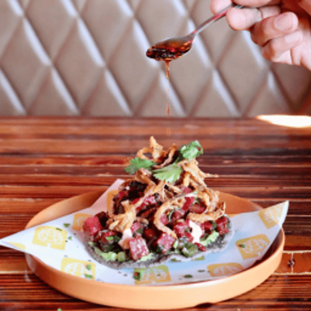 Atún fresco marinado en salsa macha de frutos rojos sobre una cama de aguacate, pepino persa, cebollita crispy, y aioli de chipótle.