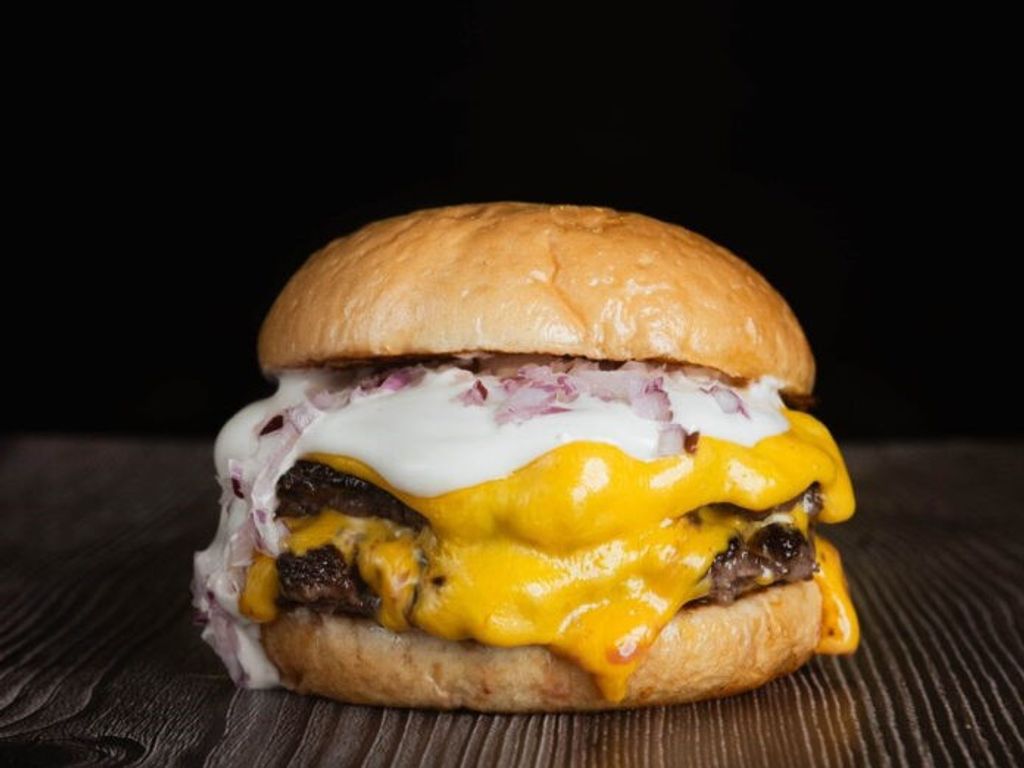 DOBLE CARNE, QUESO CHEDDAR, SALSA CHIMICHURRI BLANCA Y CEBOLLA MORADA
