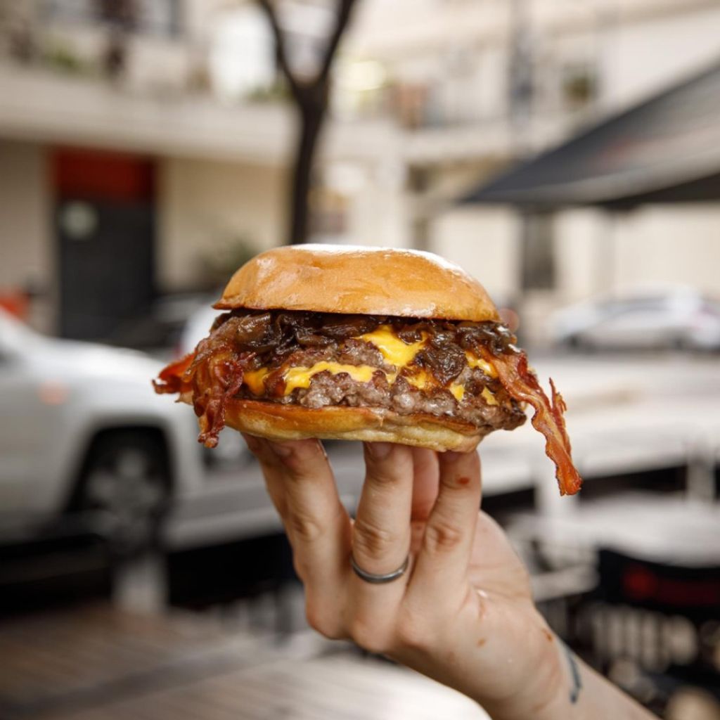 Doble carne, tocinos empanizados, mermelada de frutos rojos habanera cebolla caramelizada, Queso Gouda