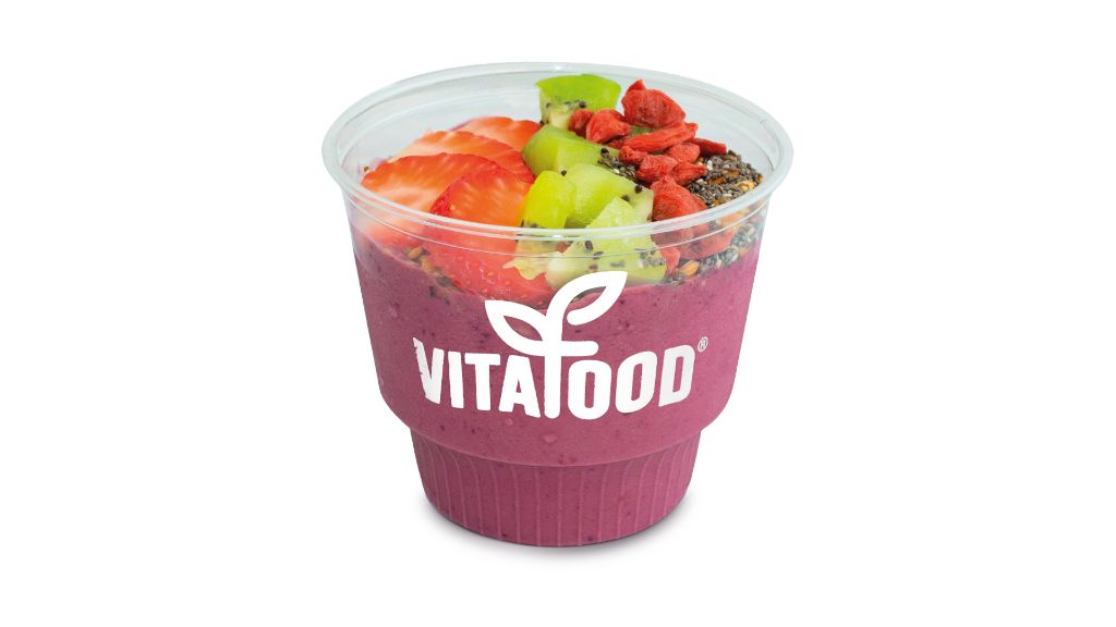 BASE: Acaí 100% orgánico + Plátano + Fresa. CUBIERTA: Granola VITAFOOD, Chía, Fresa, Kiwi, Goji Berrie.