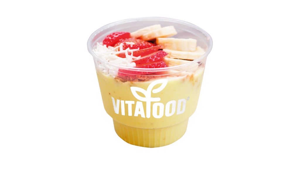 BASE: Berries + Plátano. CUBIERTA: Granola VITAFOOD, Quinoa Pop, Fresa, Plátano, Coco Rallado.