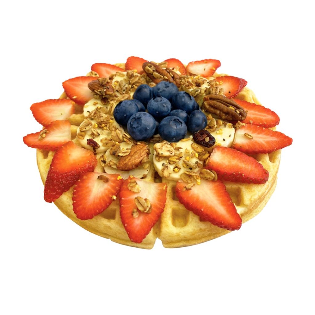 Waffle original, cubierto con fresa, plátano, arándano y crujiente granola. Acompáñalo con el untable que más te guste y disfruta de una explosión de sabor.