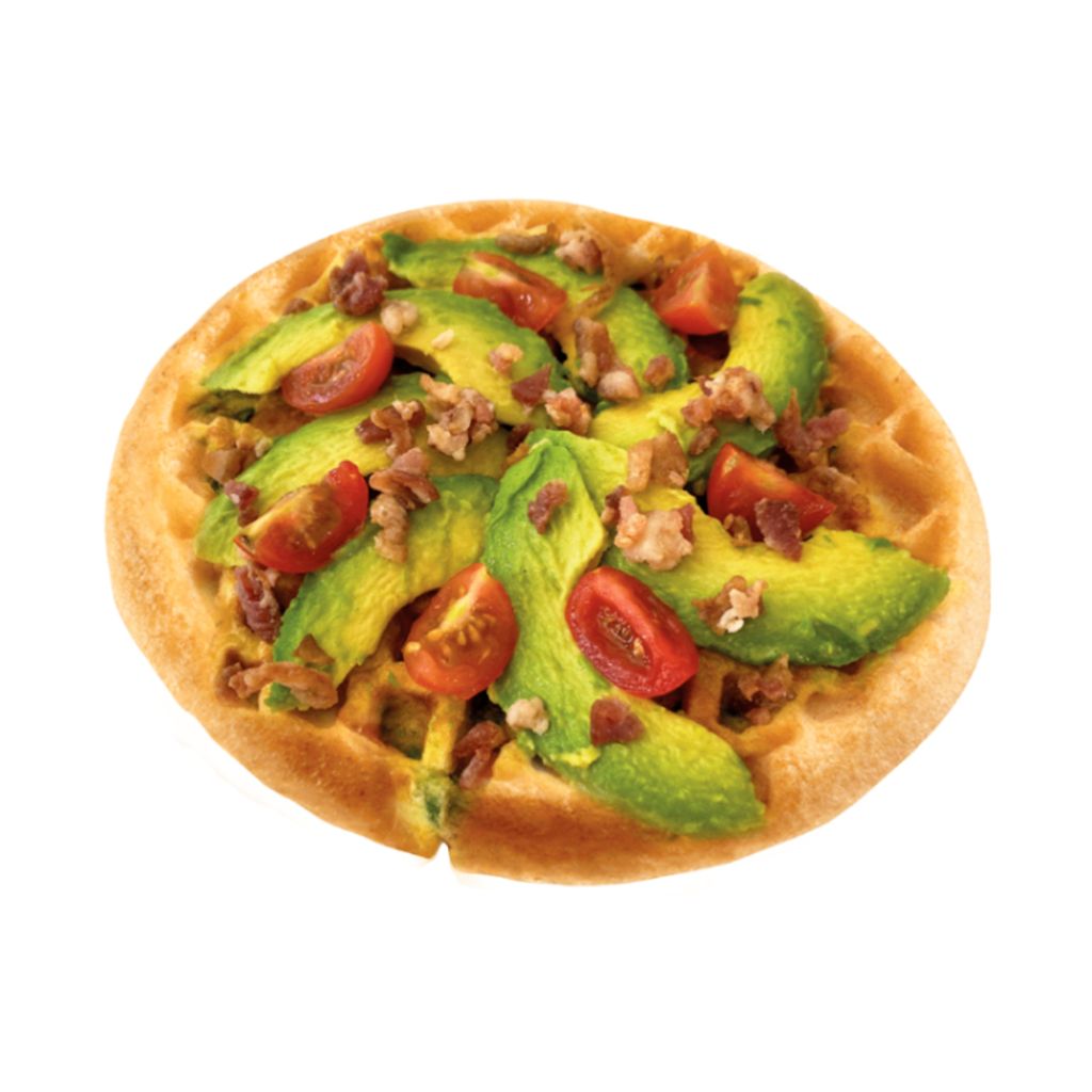 Waffle de huevo con espinaca, nutritivo y delicioso; cubierto con aguacate cremoso, jitomate cherry fresco y crujiente tocino. Acompáñalo con tu aderezo favorito.